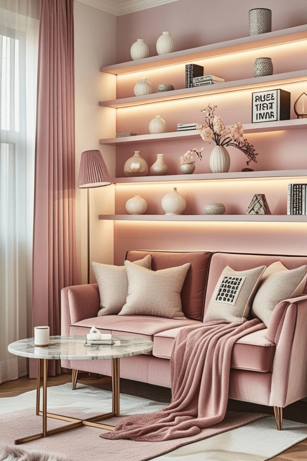 A blush pink reading nook creates a soft and relaxing corner perfect for enjoying books or quiet moments. The combination of a comfortable pink sofa, cozy pillows, and warm lighting makes the space feel inviting and elegant. Neutral textures like fluffy rugs and soft blankets add extra comfort.