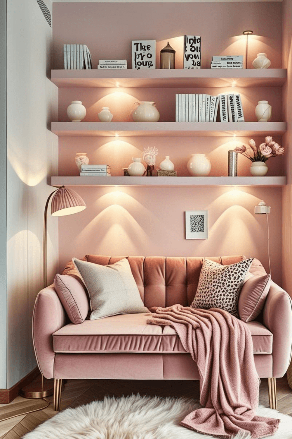 Cozy Pink Reading Corner with Warm Shelf Lighting