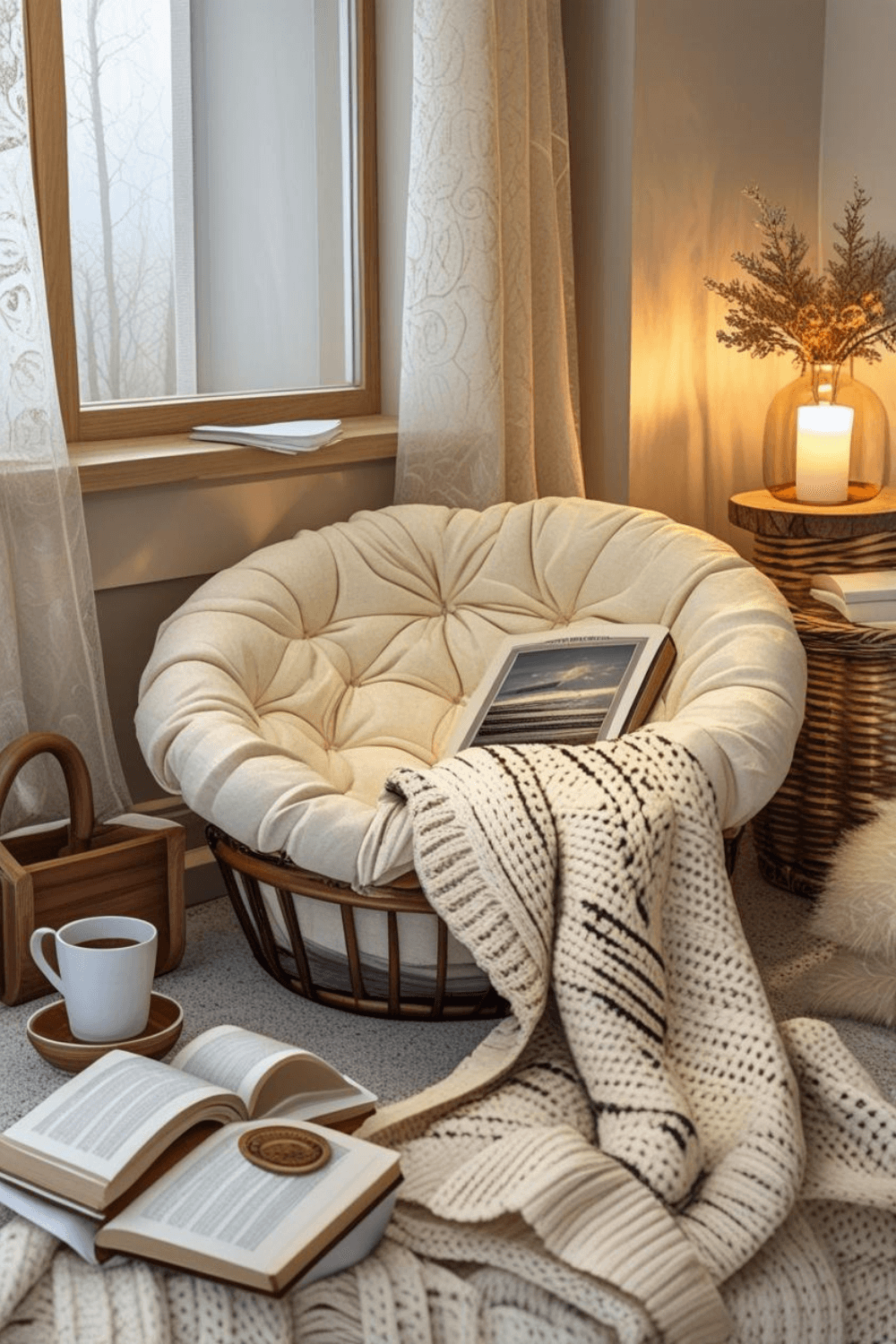A cozy rainy day reading nook creates a peaceful and relaxing corner in your home. This beautiful setup features a soft cushioned armchair placed near a large window. As a result, you can enjoy the calming view of rain outside. In addition, warm candlelight on a small wooden side table adds a soft glow to the space. A knitted throw blanket also brings extra comfort and warmth. Together, these elements make the cozy rainy day reading nook feel calm and inviting.