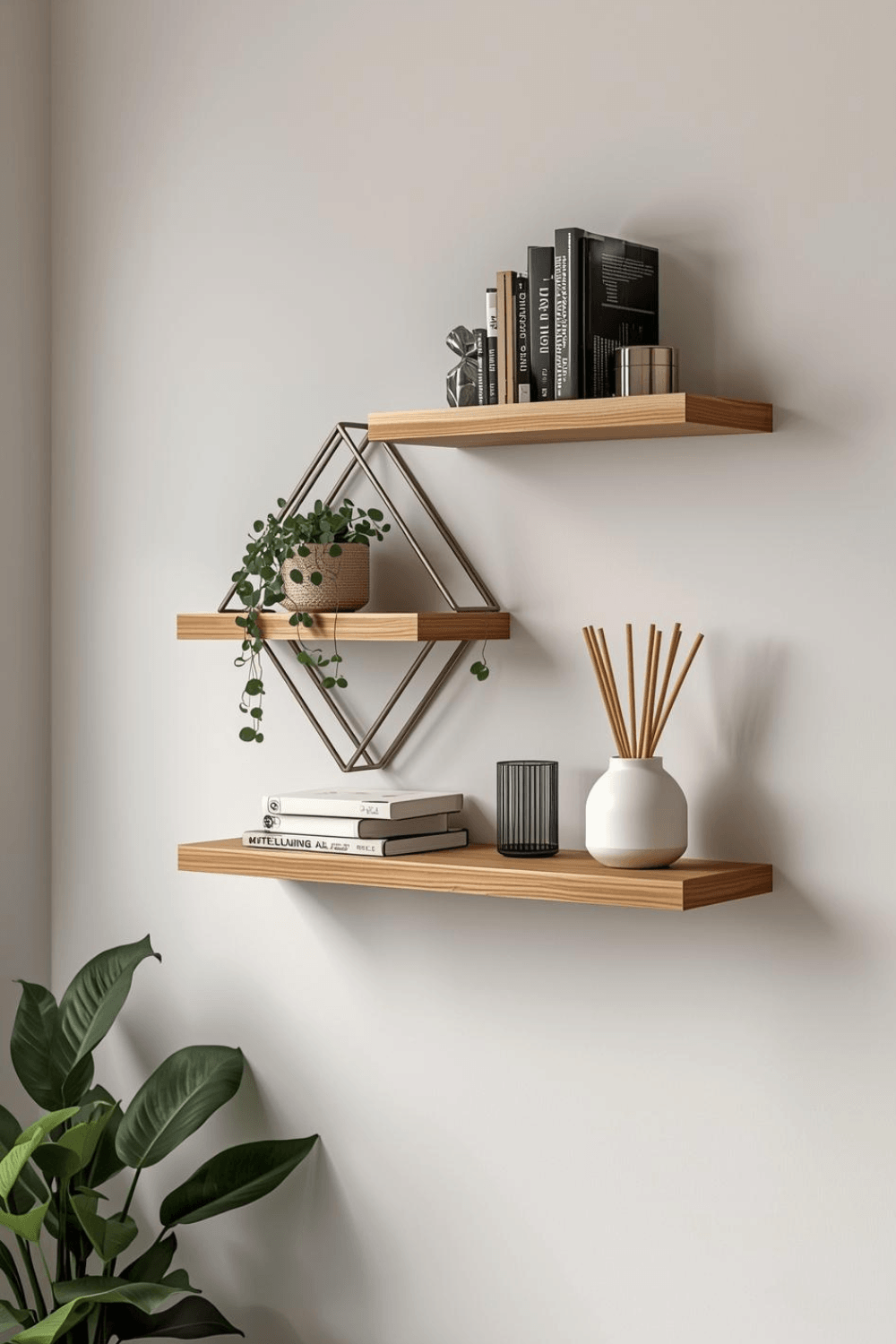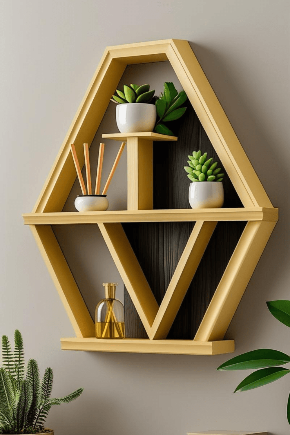 Geometric wall shelves are a modern and creative way to decorate interior walls. Their unique shape adds visual interest while still maintaining a minimalist aesthetic. Natural wood textures combined with greenery create a perfect balance between modern and organic design.