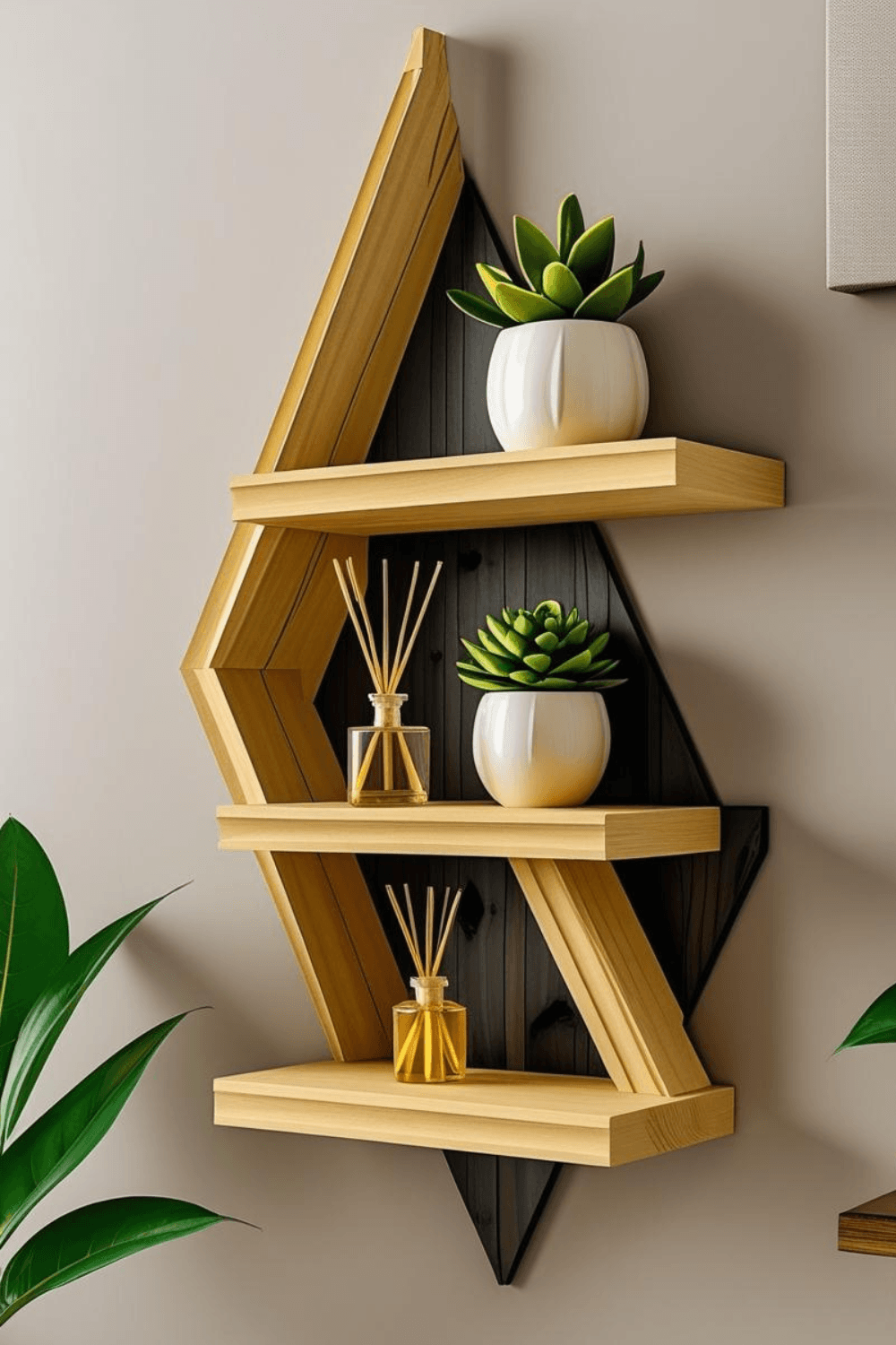 Creative floating shelf wall decor is a stylish way to make empty walls look more interesting. The geometric wooden design creates a modern artistic element that works beautifully in contemporary homes.