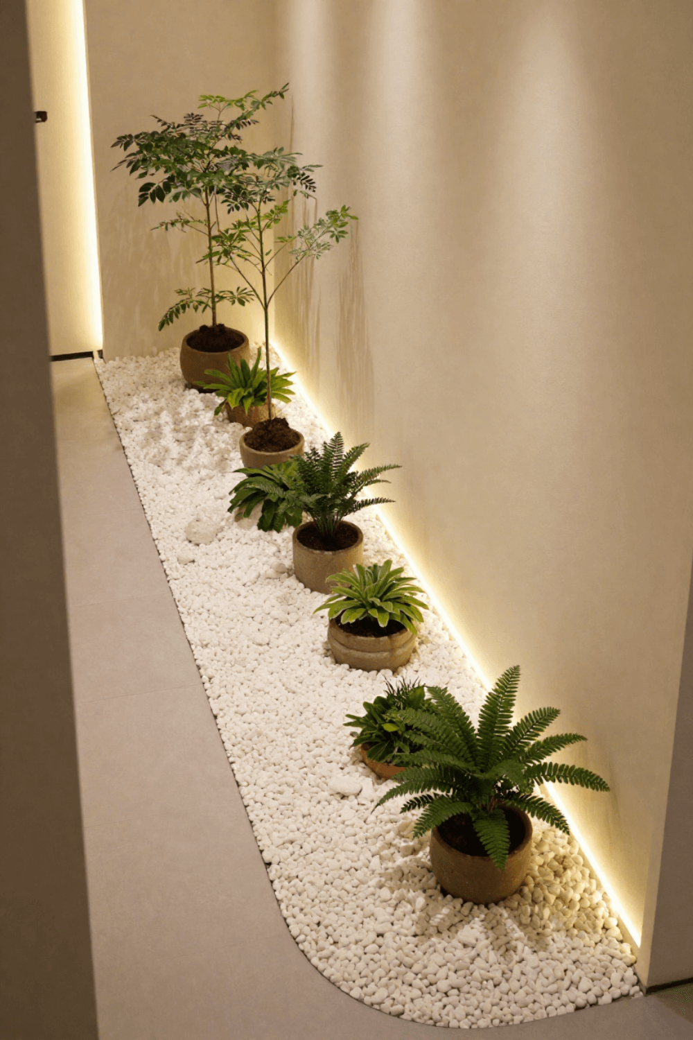 In this hallway design, white decorative pebbles create a clean base for large potted plants while wooden wall panels and soft lighting add warmth and depth. The combination of natural materials and minimalist styling brings a peaceful, spa-like atmosphere into the home. If you are looking for indoor pebble garden ideas that feel modern, elegant, and easy to maintain, this design offers beautiful inspiration for upgrading your hallway space.
