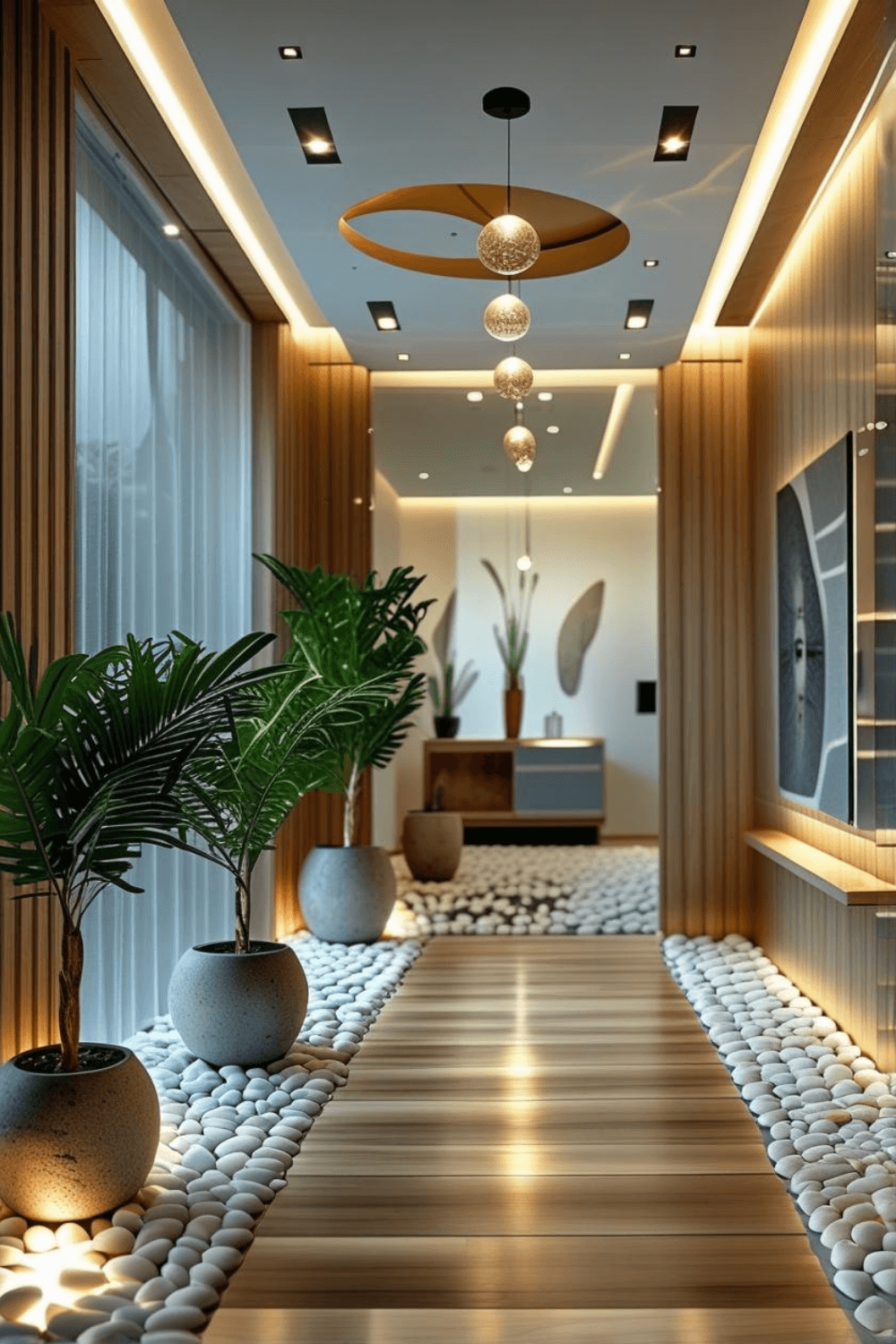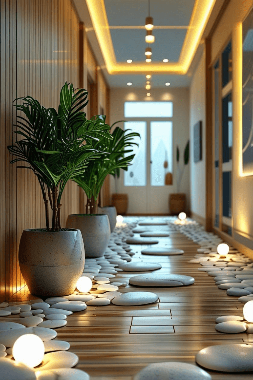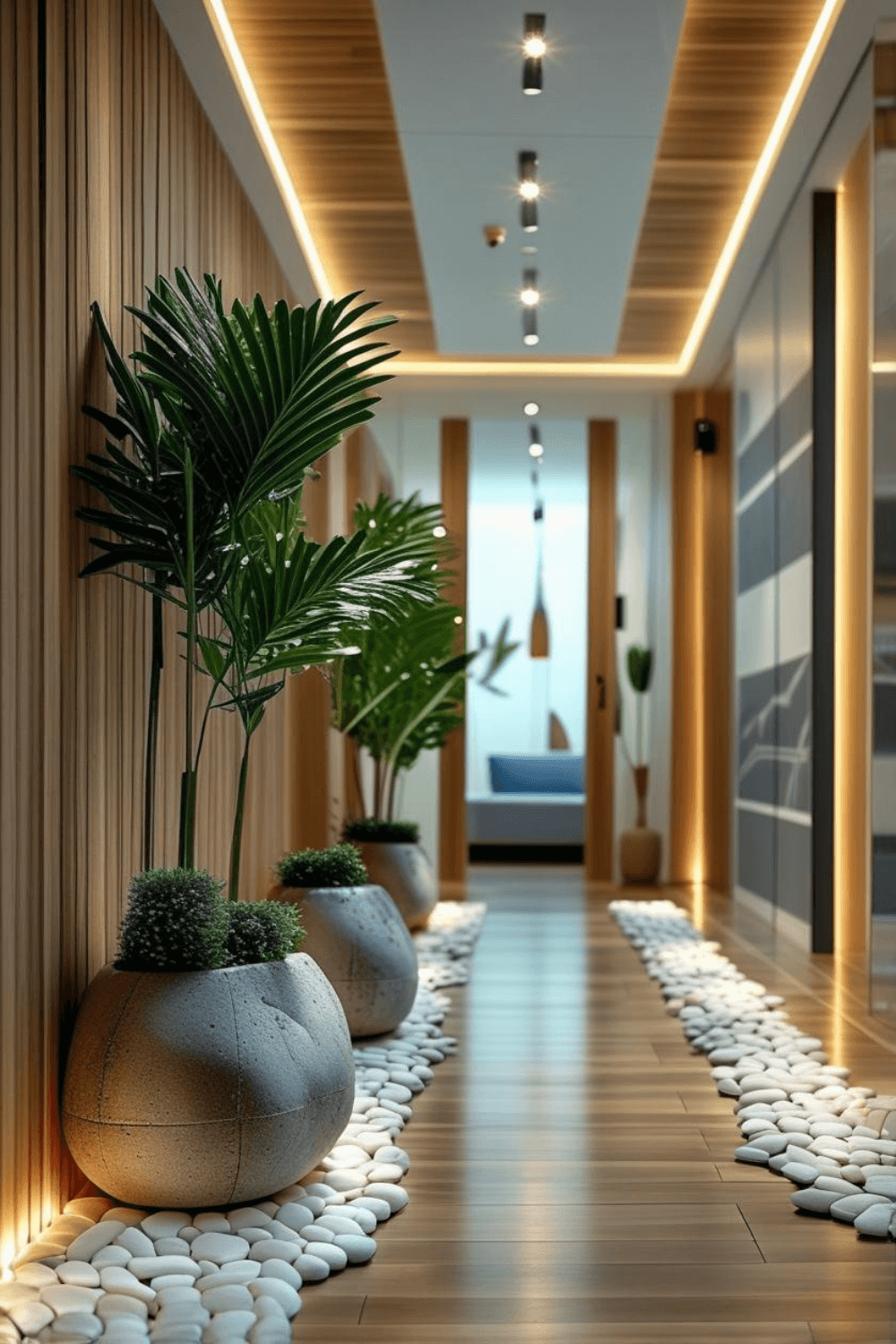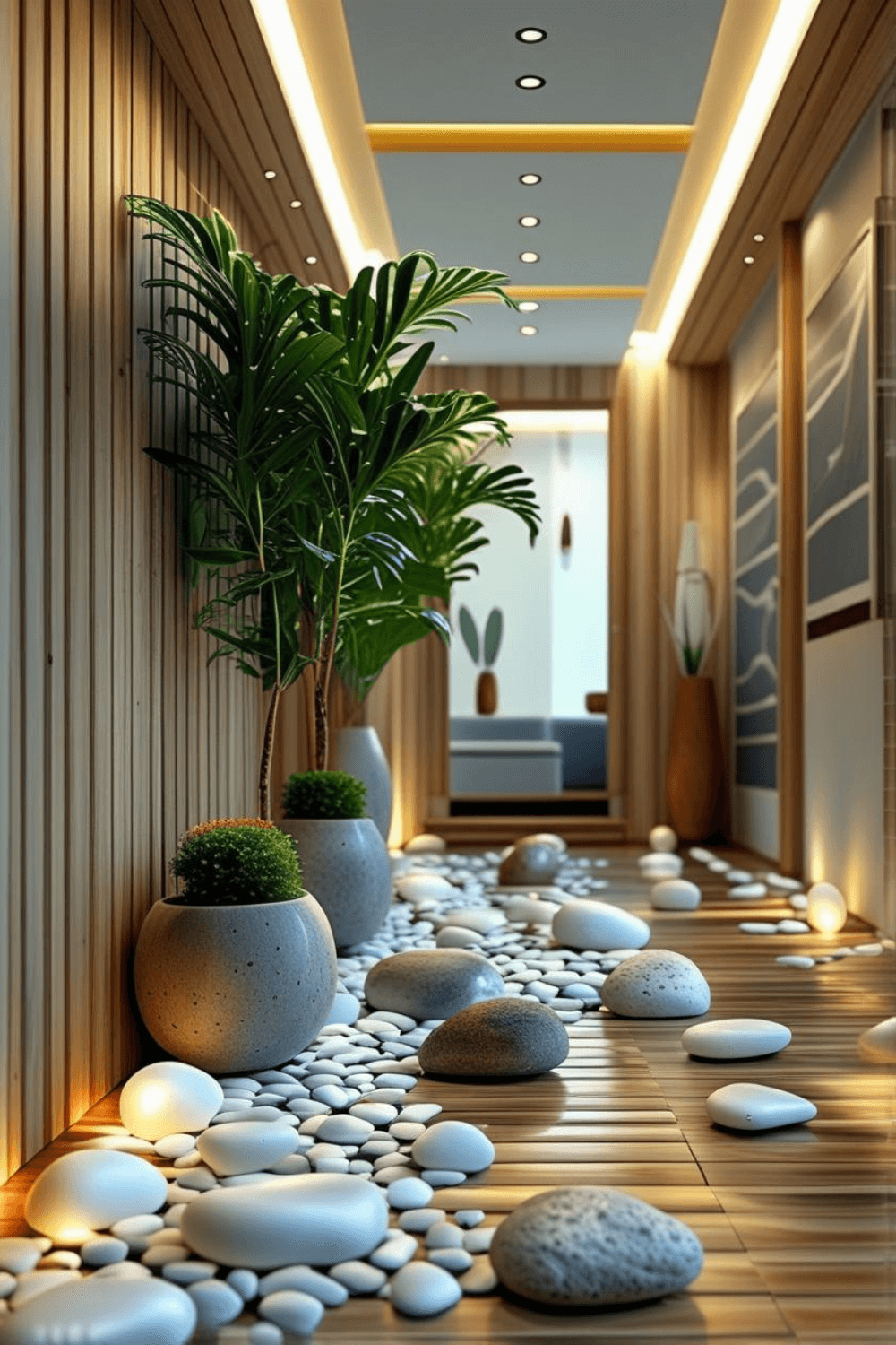 Combining pebbles, plants, wood textures, and warm lighting creates a hallway that feels similar to a luxury spa environment. Instead of a simple corridor, the space becomes a relaxing pathway through the home.