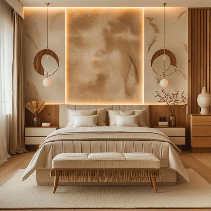1. Modern Beige Bedroom Design Ideas with LED Backlit Accent Wall