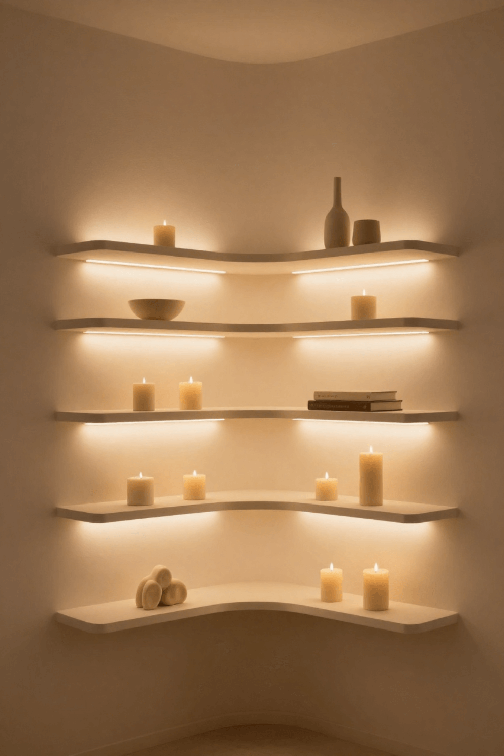 Modern curved corner shelf decor ideas often focus on lighting as the main feature. In this setup, soft candlelight enhances the gentle curves of the floating shelves, creating depth and shadow against the neutral wall. The warm glow highlights the sculptural shape while keeping the overall design minimal.