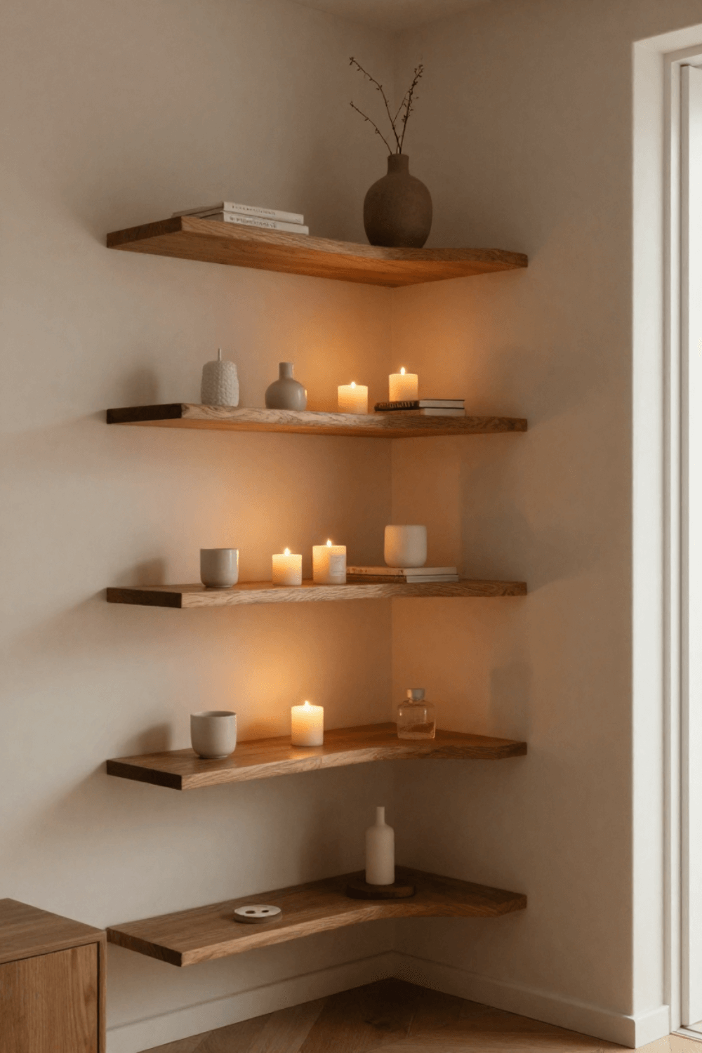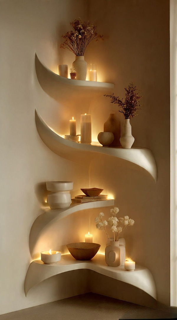 Modern Curved Corner Shelf Decor Ideas with Warm Candle Styling