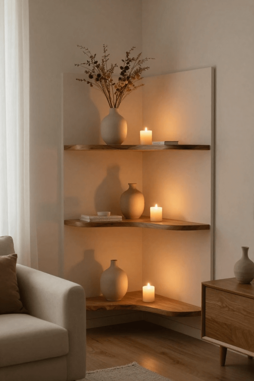 6. Soft Beige Corner Shelf Decor for Warm Interiors
