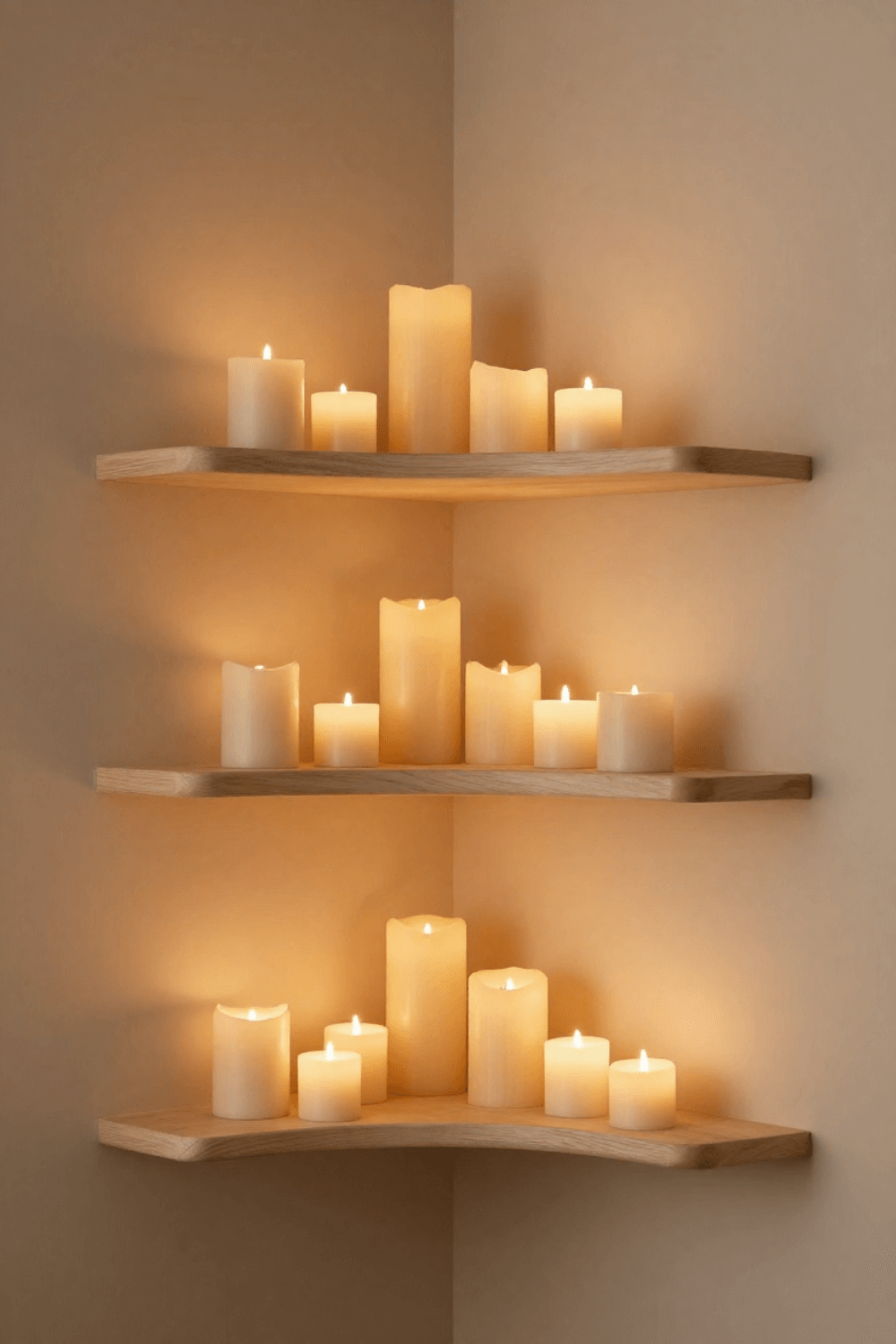 Layered candle styling transforms curved floating shelves into a glowing focal point. Using pillar candles, glass hurricane holders, and small tea lights creates depth and dimension.