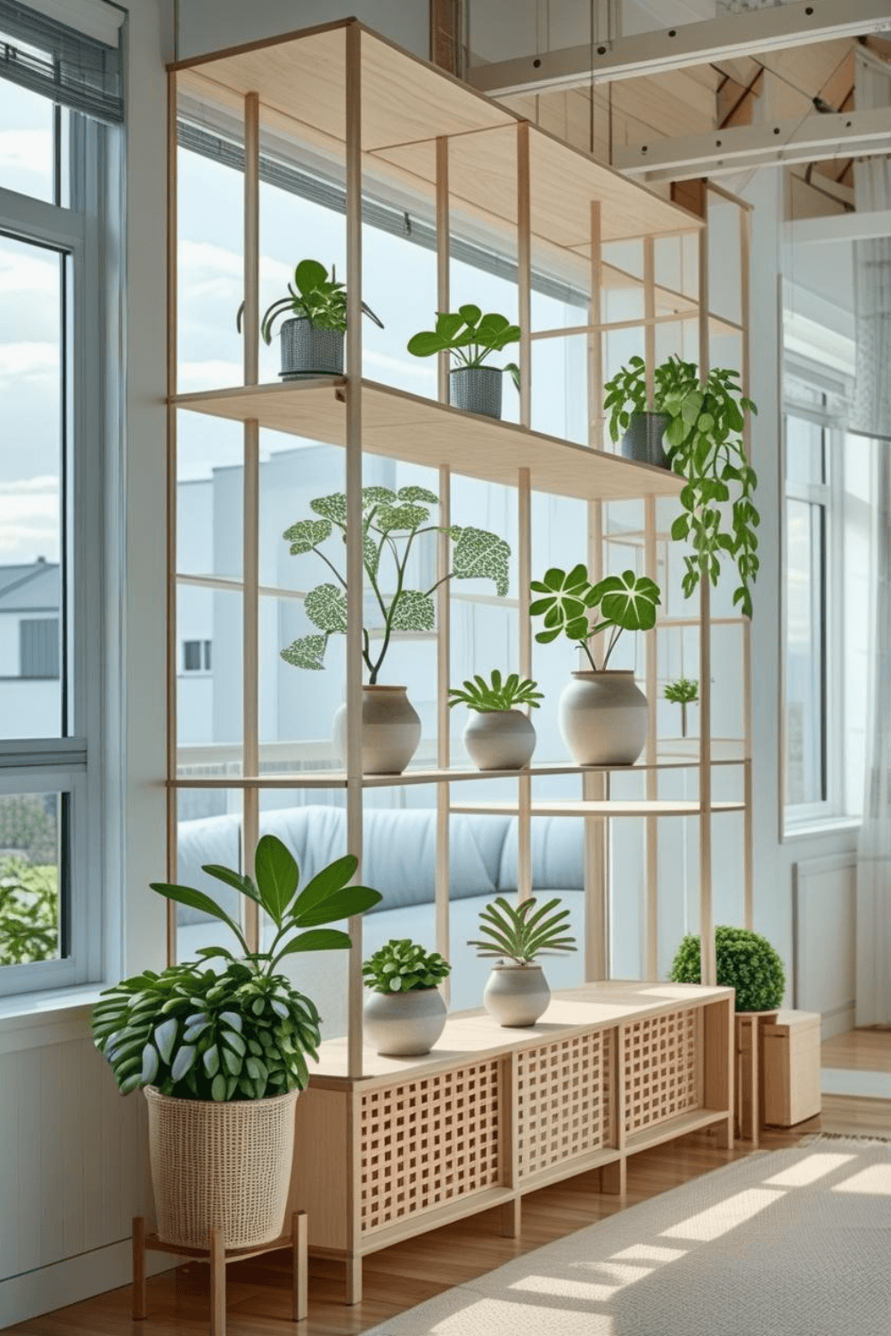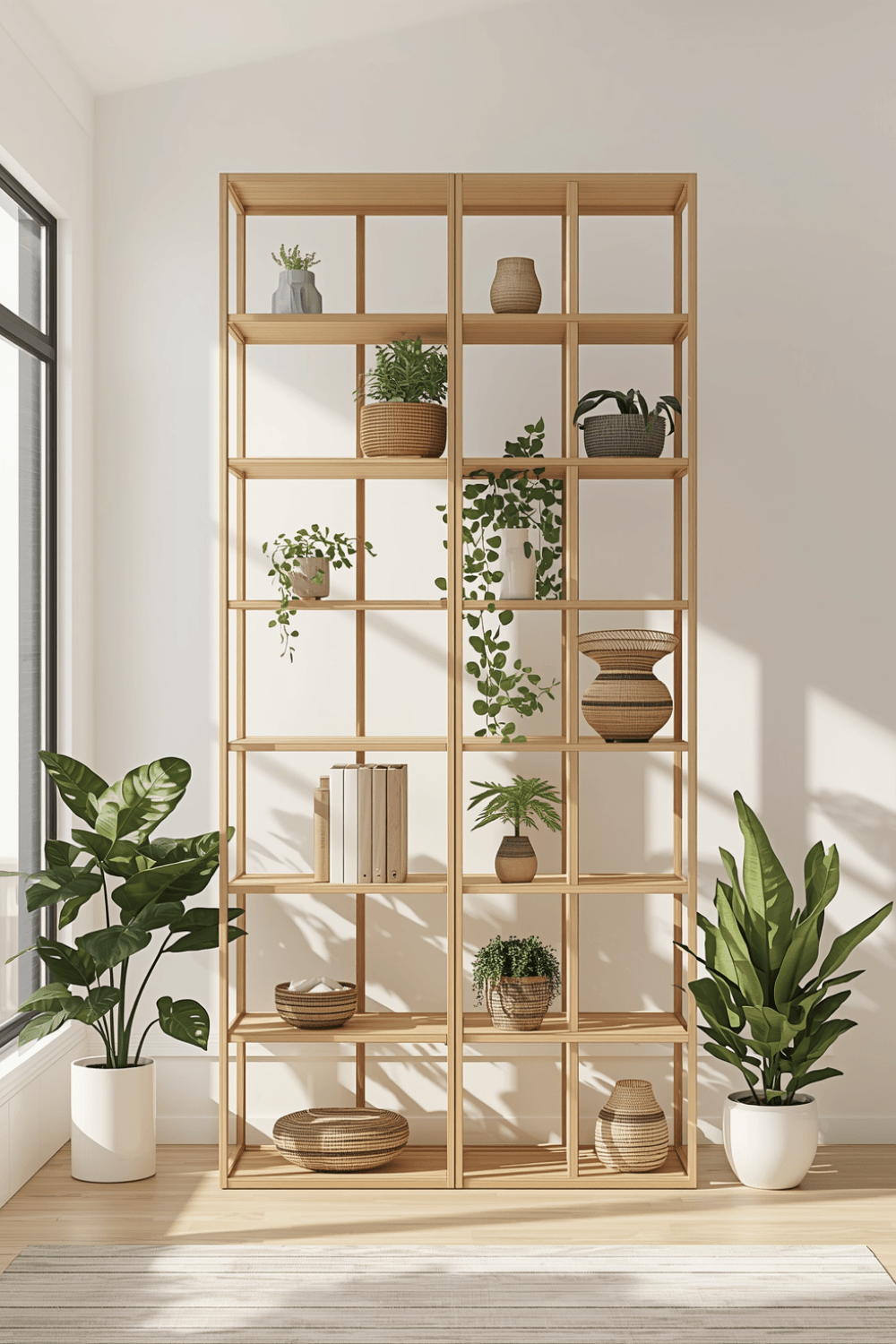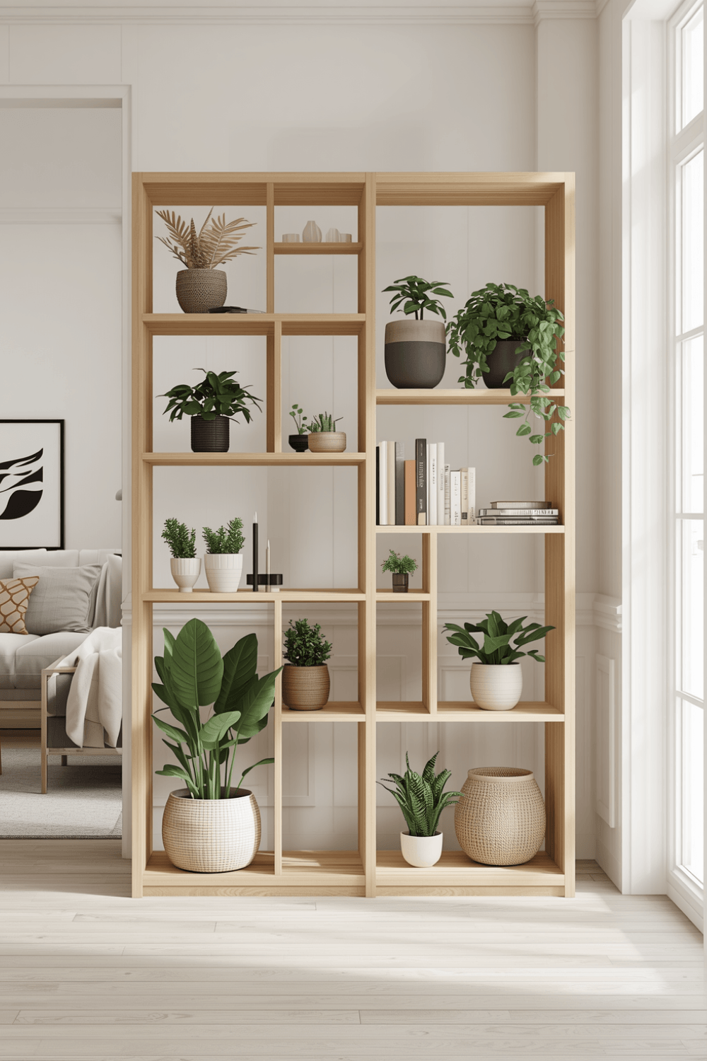 Enhance your home with a modern wooden room divider shelf that perfectly blends style and functionality. This Scandinavian open shelving unit with indoor plants creates a bright, airy feel while offering smart storage for contemporary living spaces.
