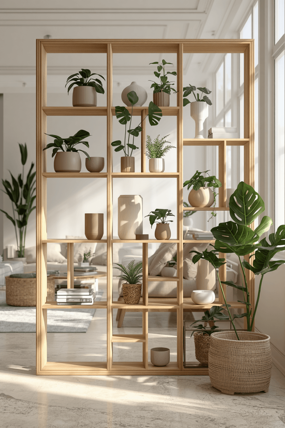 Elegant Wooden Room Divider Shelf with Indoor Plants for Cozy Living Room Spaces