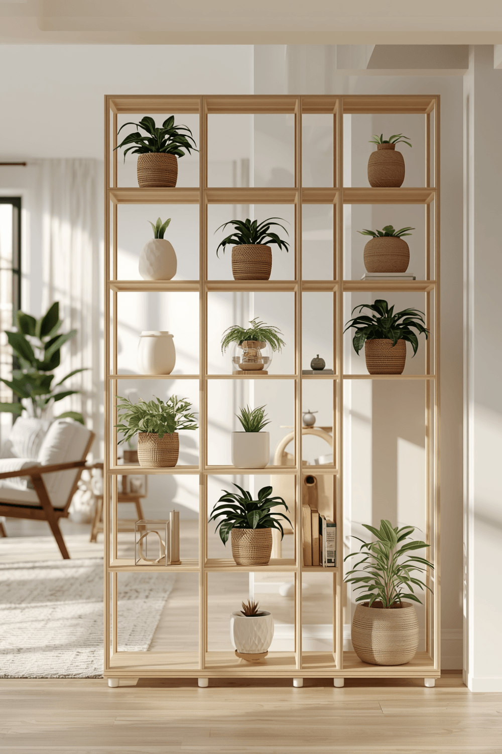 Minimal Grid Wooden Room Divider Shelf with Indoor Plants for Small Modern Homes