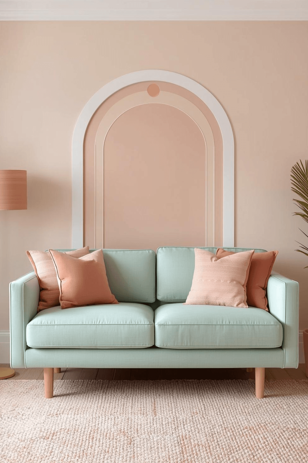 A simple wall mural or accent wall behind the sofa can add depth and artistic appeal to the room. Round coffee tables, soft rugs, and decorative cushions help complete the design. This pastel living room decor idea is perfect for creating a peaceful and stylish home interior.