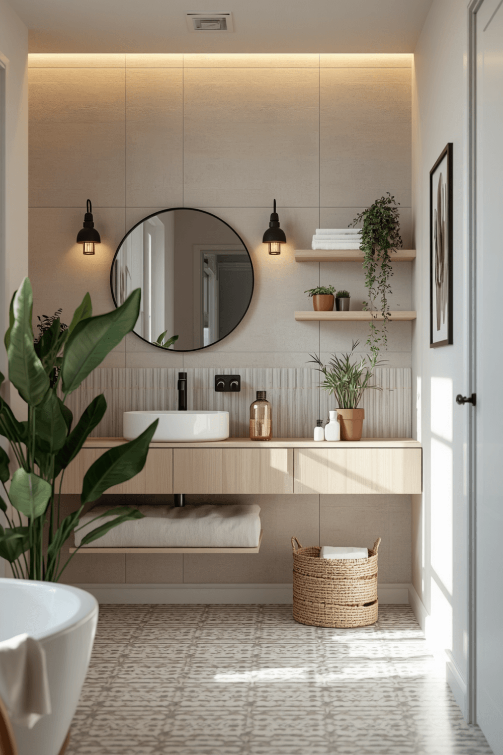 Wooden shelves and greenery can completely transform a bathroom into a cozy retreat. The natural texture of wood combined with fresh plants creates a relaxing atmosphere. Adding soft lighting enhances the warmth and makes the space feel inviting. This design works especially well in small bathrooms where every detail matters. By keeping the color palette neutral, the decor feels balanced and calming. It’s a simple yet effective way to bring life and style into your bathroom without overwhelming the space.