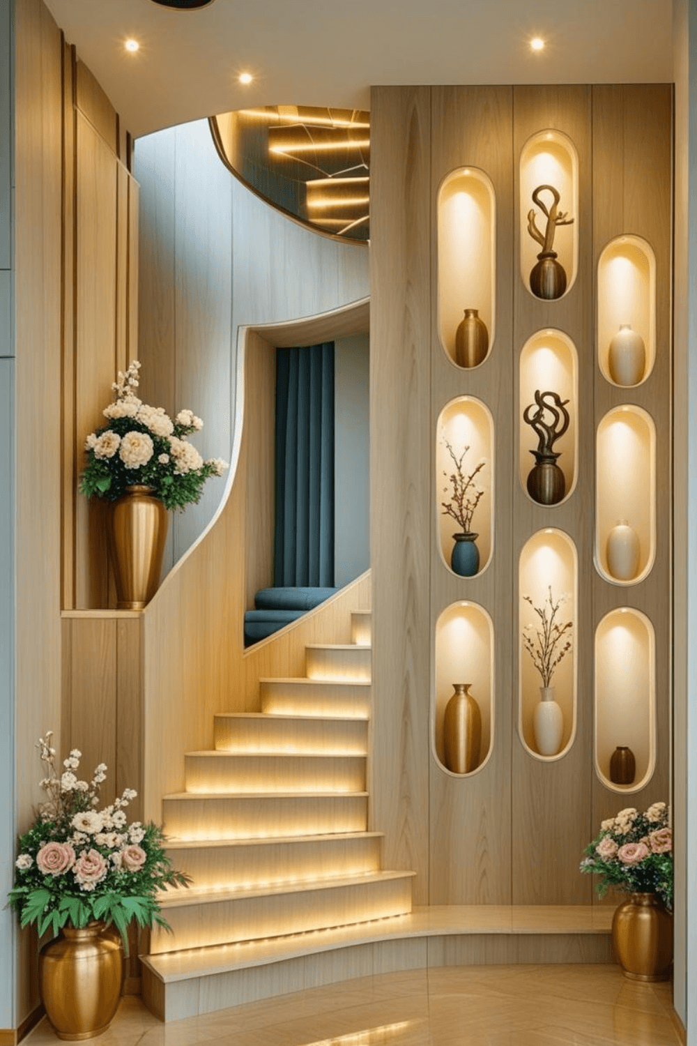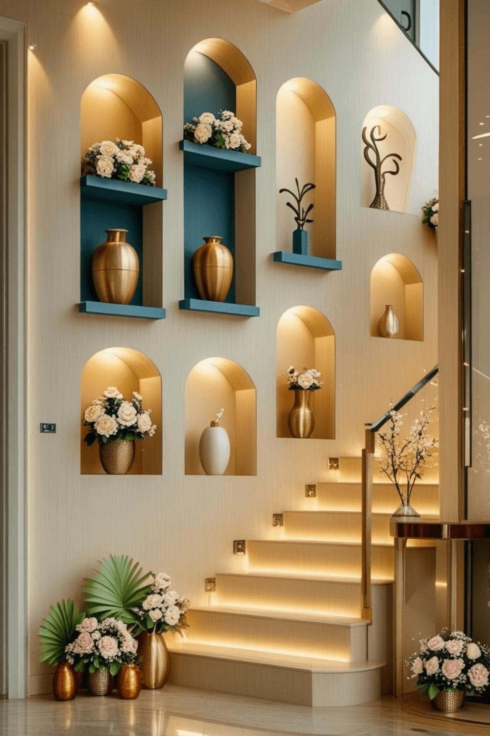 Elegant staircase wall niches are a popular feature in luxury interior design. These niches provide a stylish space to display decorative vases, sculptures, and floral arrangements. Soft lighting inside the niches enhances the beauty of the decor and creates a warm atmosphere.