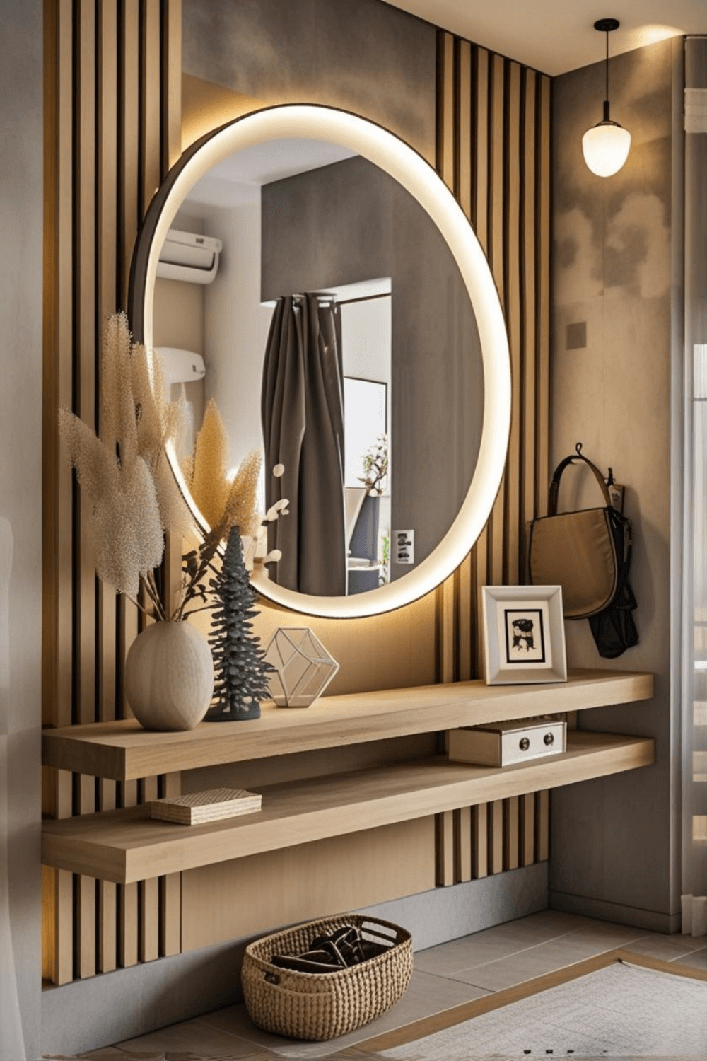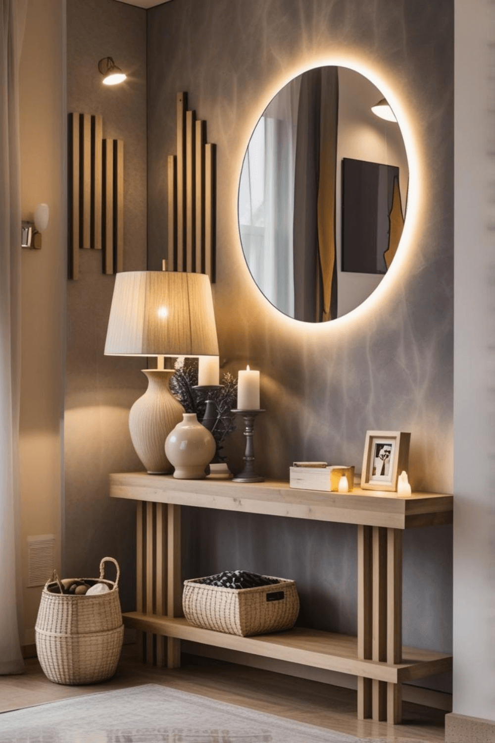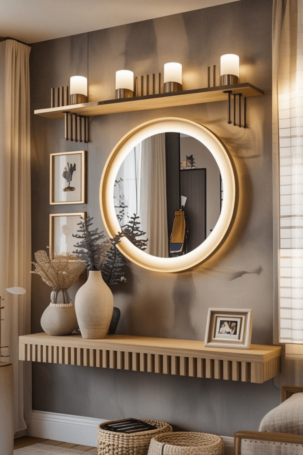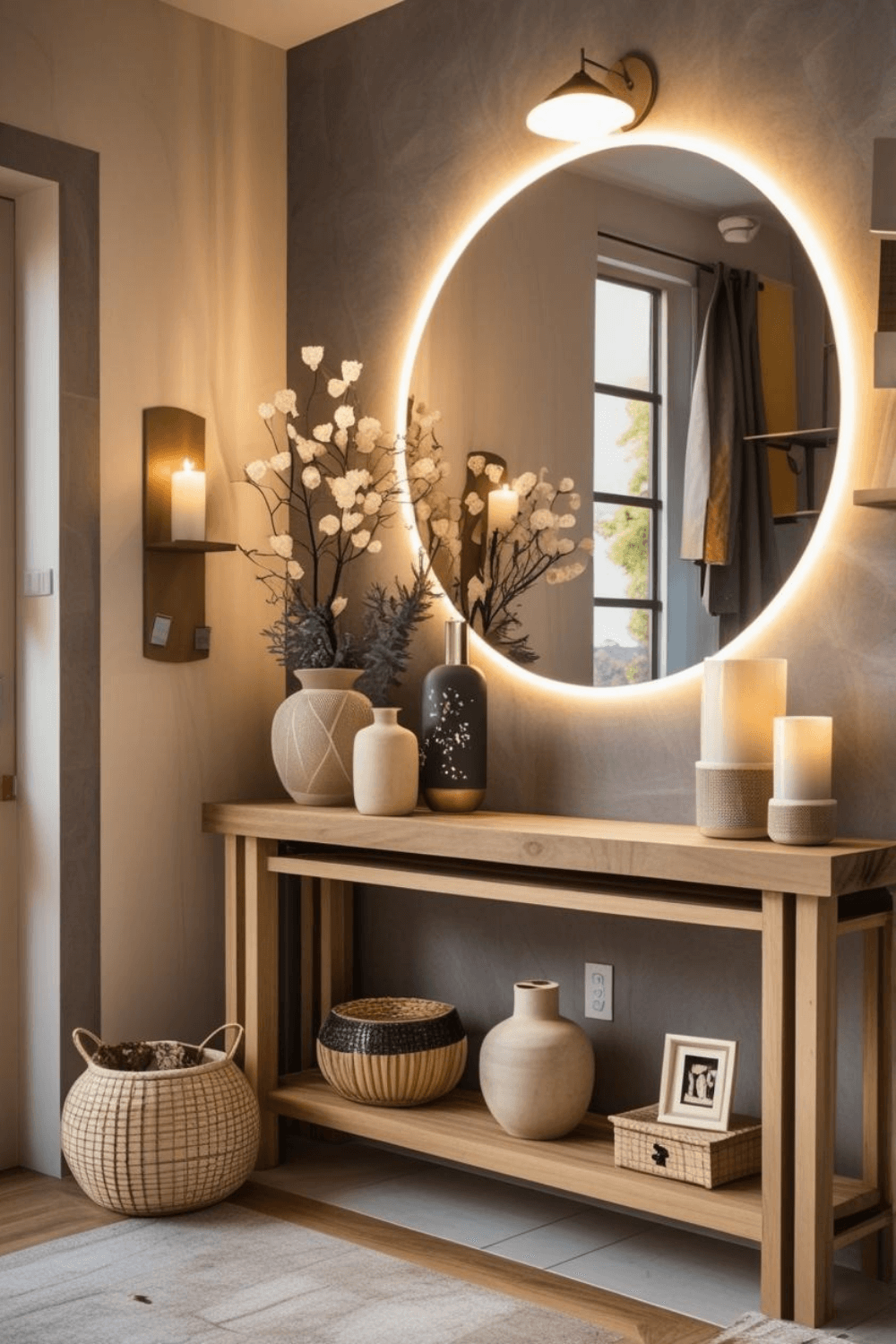 A beautifully styled entryway can instantly make a home feel more welcoming and organized. Instead of leaving the wall empty, adding a floating console shelf with a large round mirror creates a stylish focal point that feels both modern and practical. These entryway console table decor ideas show how simple elements like warm lighting, natural wood, and neutral accessories can transform a small entrance into an elegant and inviting space.