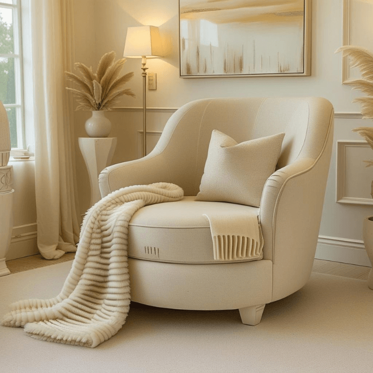 A small seating area also adds function. It provides a place to unwind, read, or simply add another layer of texture. In neutral interiors, these small additions make the room feel thoughtfully designed rather than staged.