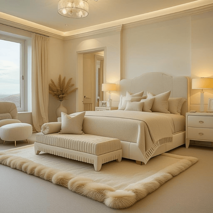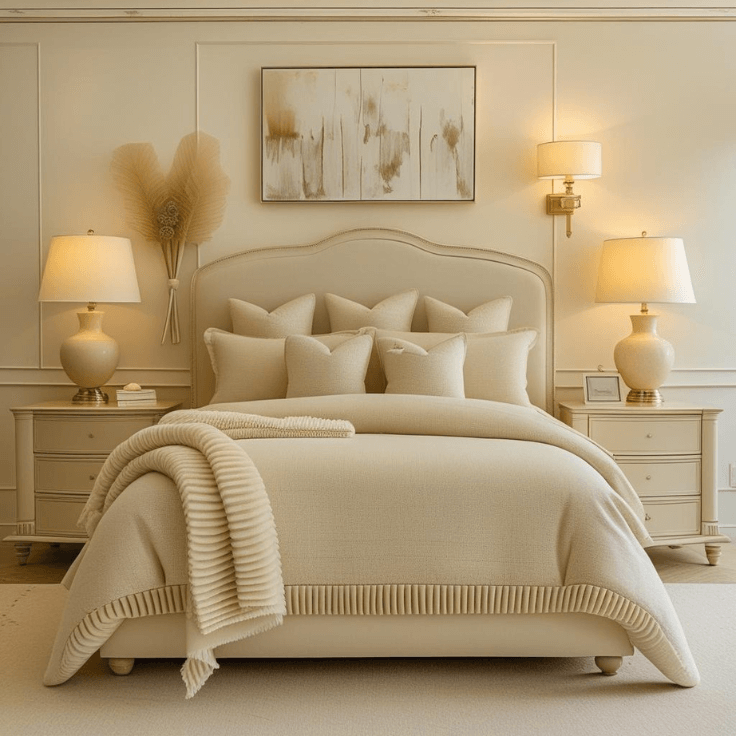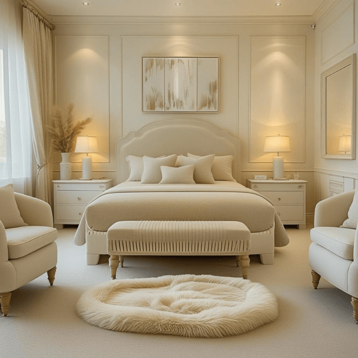 Warm cream bedroom design ideas create a space that feels peaceful, refined, and effortlessly inviting. This bedroom shows how layering ivory, beige, and soft textures can transform a simple layout into something that feels both luxurious and comforting. The upholstered bed, plush rug, matching lamps, and gentle lighting all work together to produce a calm, cohesive atmosphere.