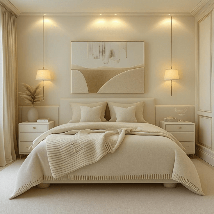 10 Warm Cream Bedroom Design Ideas with Layered Neutral Bedding and Cozy Lighting for a Soft Elegant Look