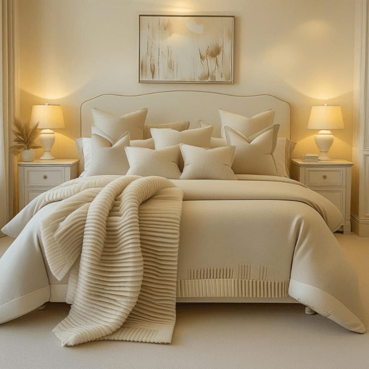 Keeping all tones within ivory and beige ensures harmony. The subtle variation between cushions and bedding gives a hotel-inspired finish.