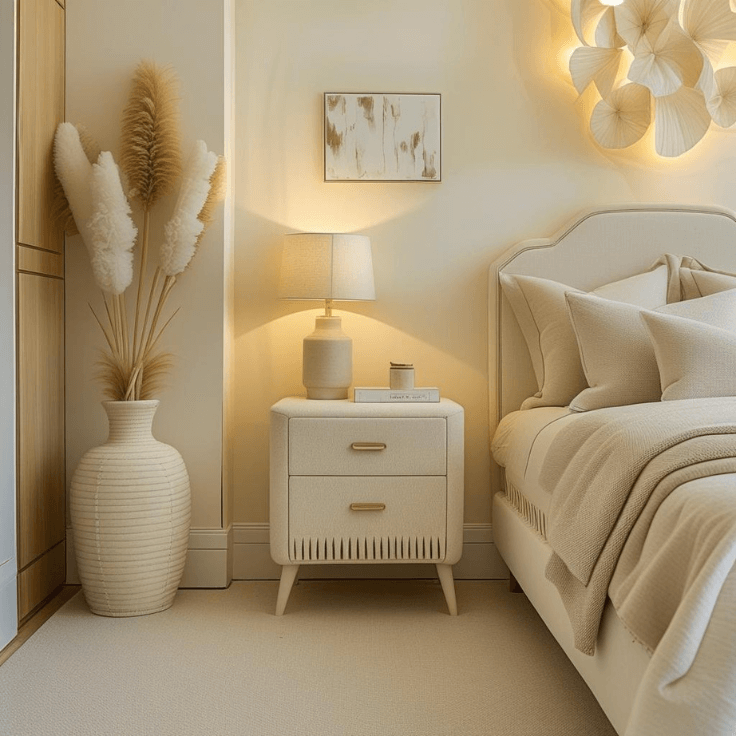Placing natural decor on bedside tables keeps styling simple yet elegant. Warm cream bedroom design ideas benefit greatly from small touches that feel effortless rather than decorative.